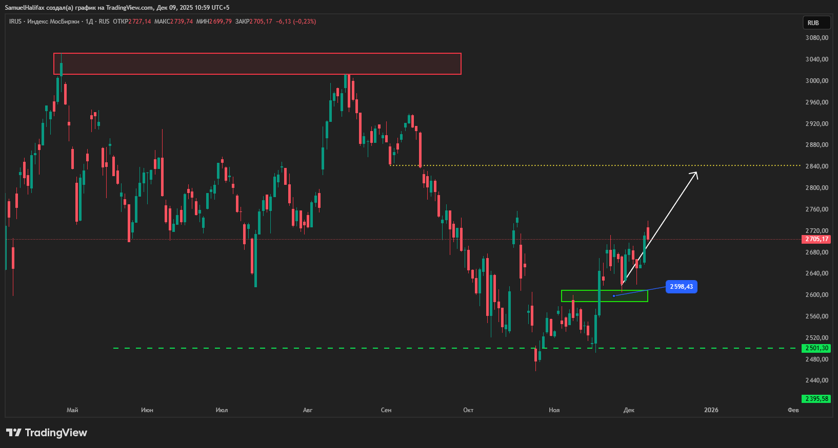 Индекс Мосбиржи на этой неделе показал хорошую бычью динамику: он прибавил примерно 2.5%, но на утро вторника немного откатывает назад.