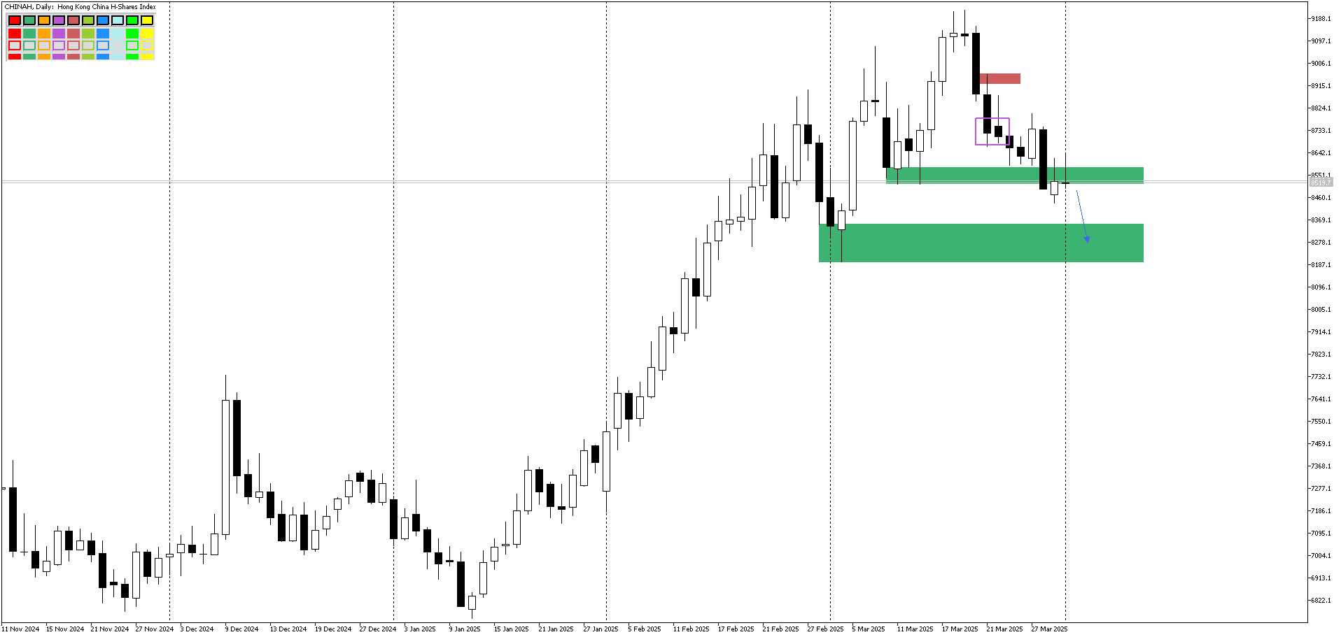 По CHINAH пока сохраняется слабость, но следует помнить, что этот индекс может отправиться вверх, если по тарифам будет более позитивный исход, чем обещалось. Достаточно будет если Трамп введёт не 100, а 25 санкций, это будет уже успех, и индекс может отправиться покорять северные высоты. Поэтому специалисты «Паритета» рекомендуют работать здесь после 2 апреля.