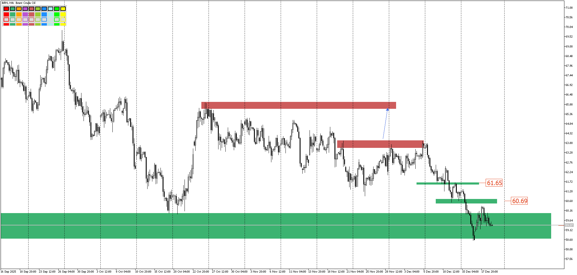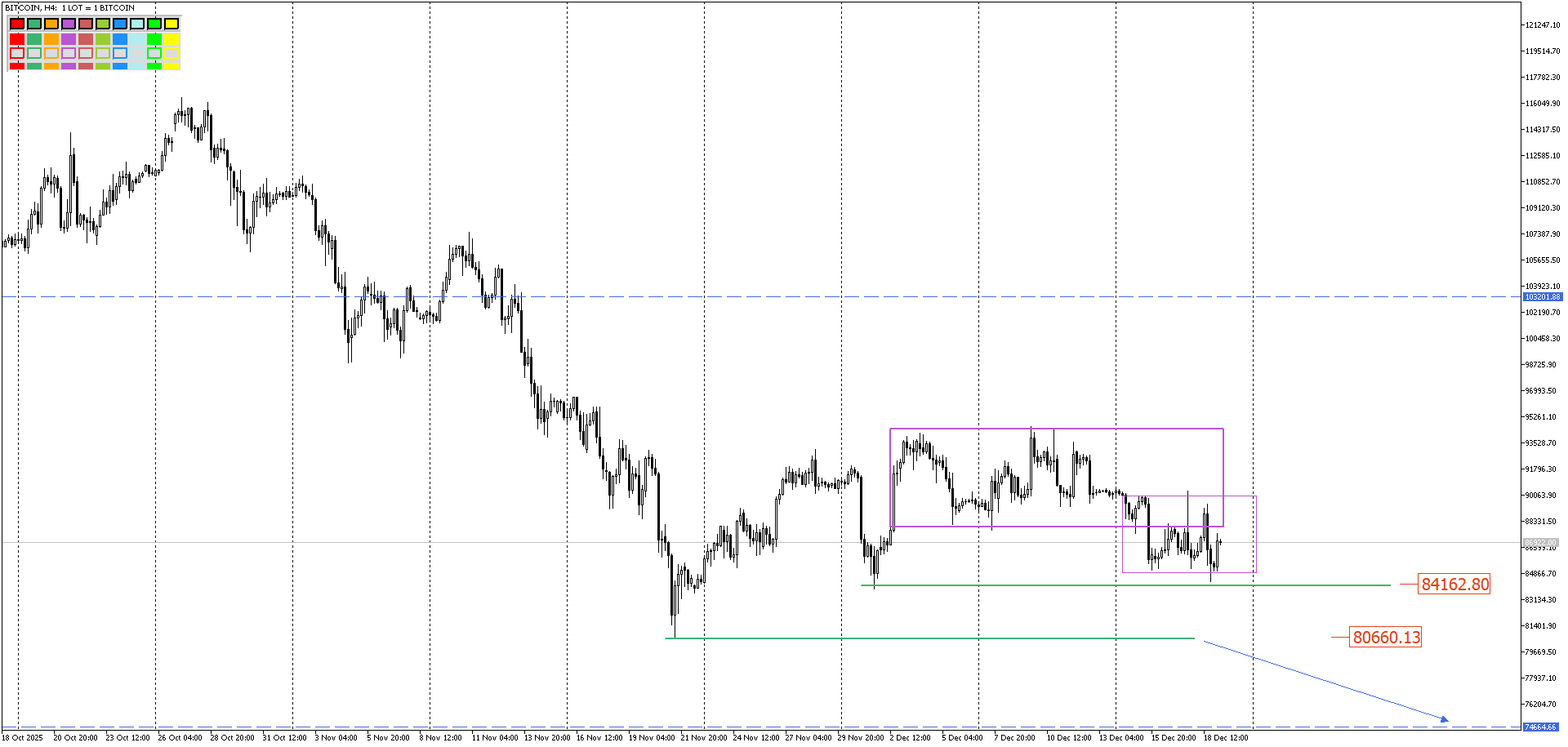 Биткоин выбрался из боковика и тут же отрисовал ещё один, меньшего размера. Эта формация наиболее часто отрабатывает как продолжение движения в шорт. Да и шортовые импульсы на Н2-Н4 вторят возможности этого. Так что пока основной сценарий для битка – дальнейшее движение вниз.