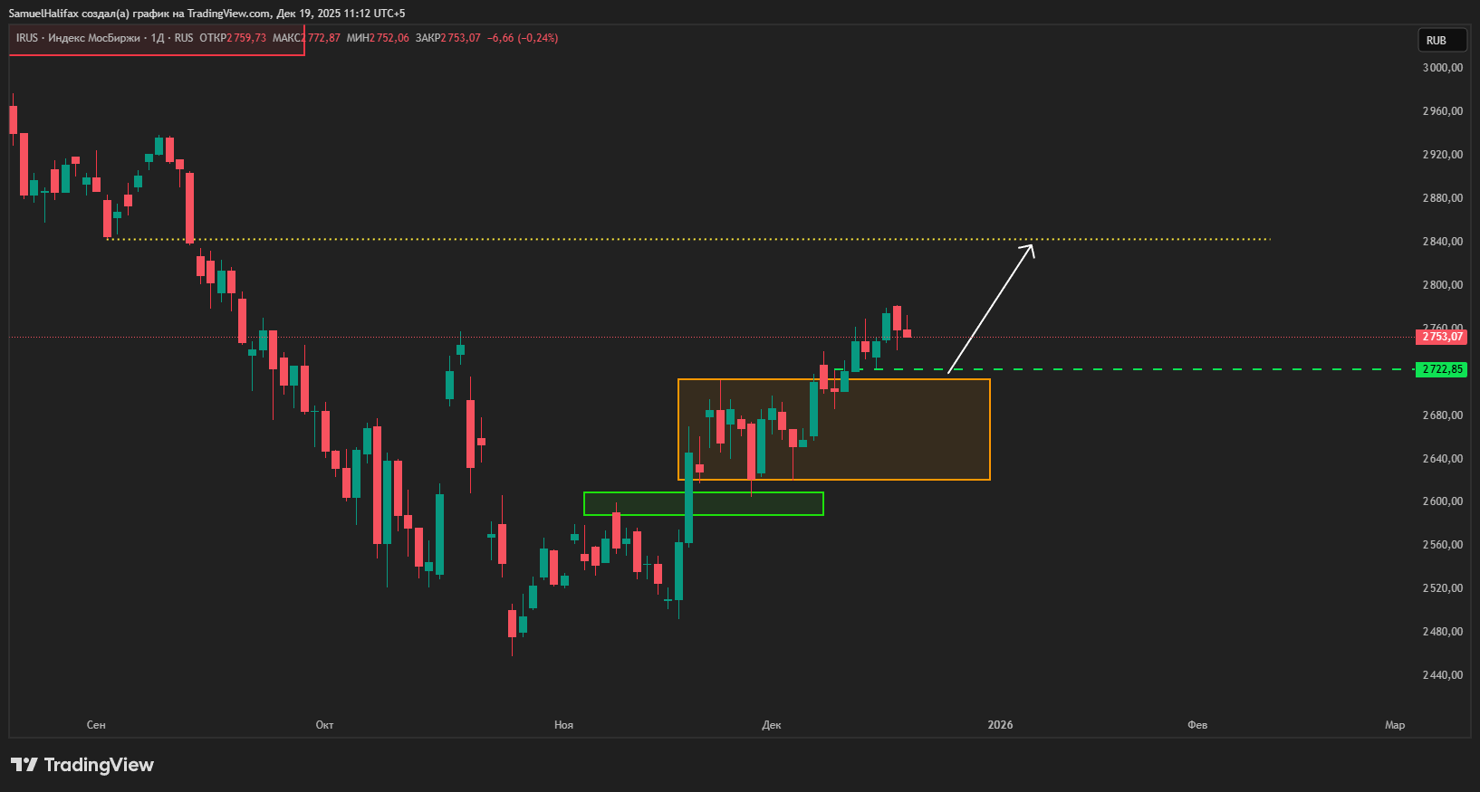 Поскольку большую часть движения в индексе Мосбиржи мы уже прошли, то пришла пора зафиксировать большую часть прибыли. После заседания Банка России можно понаблюдать за уровнем 2730 – это верхняя часть локального боковика: если он устоит, то можно попробовать реализовать лонги на следующей неделе и всё же доработать до нашей цели 2800-2850.