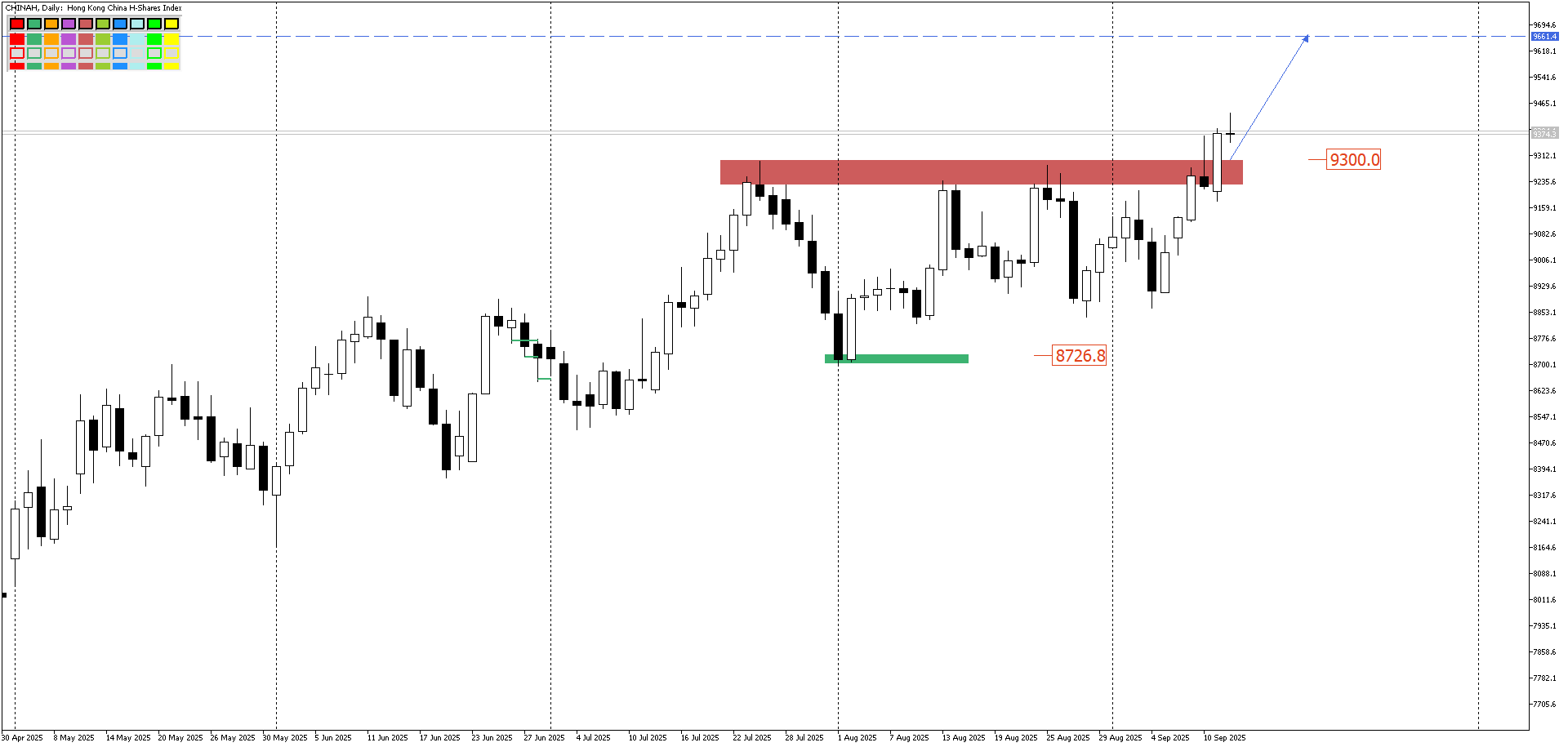 Гонконгский CHINAH, наконец, выходит из своей проторговки, в которой он уже успел хорошо обосноваться. 9300 пробит, и, скорее всего, путь на север продолжится. Как и у американских собратьев по борьбе.